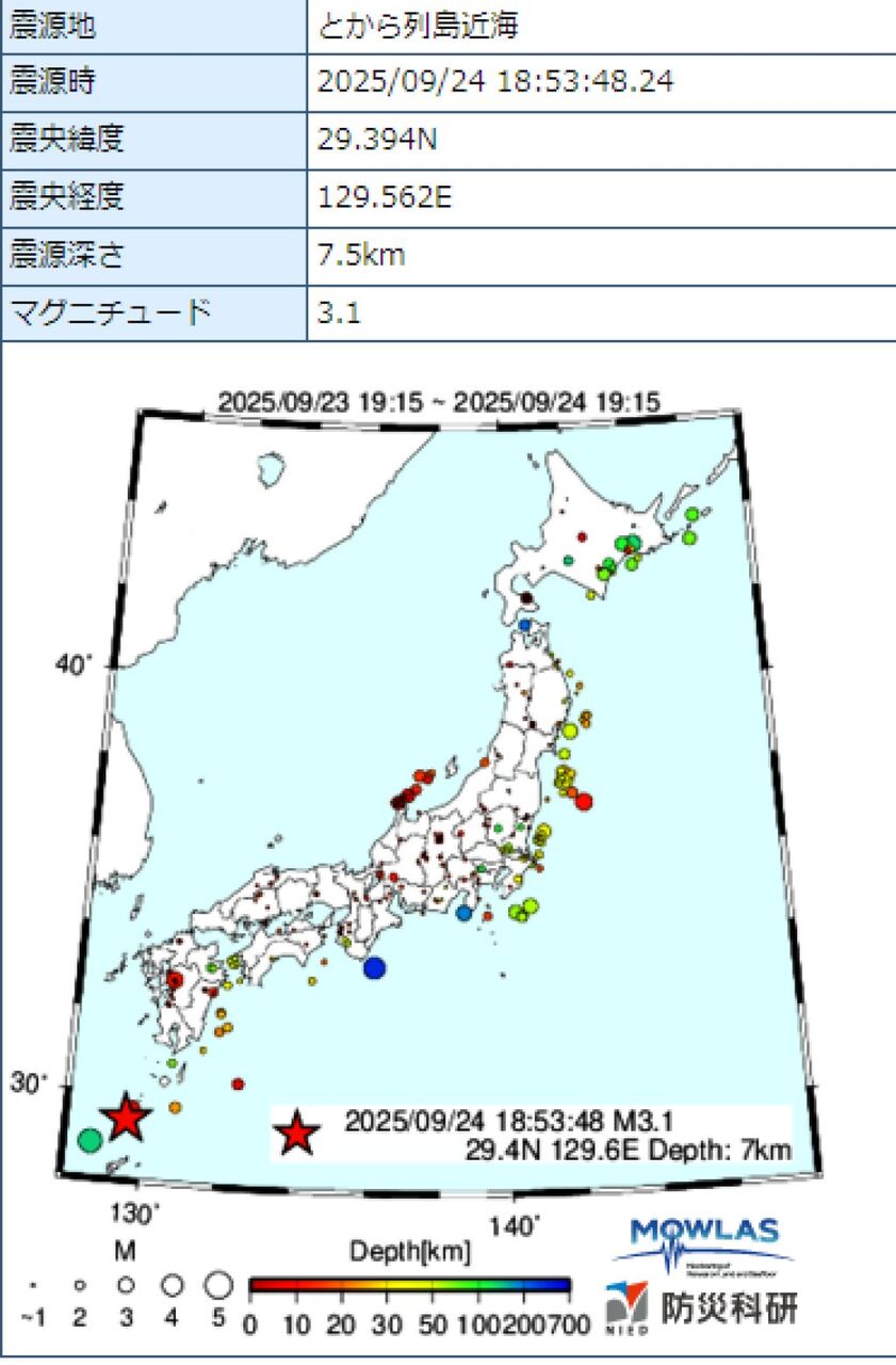 2025年9月17日 22時06分ごろトカラ列島近海 3.4 3