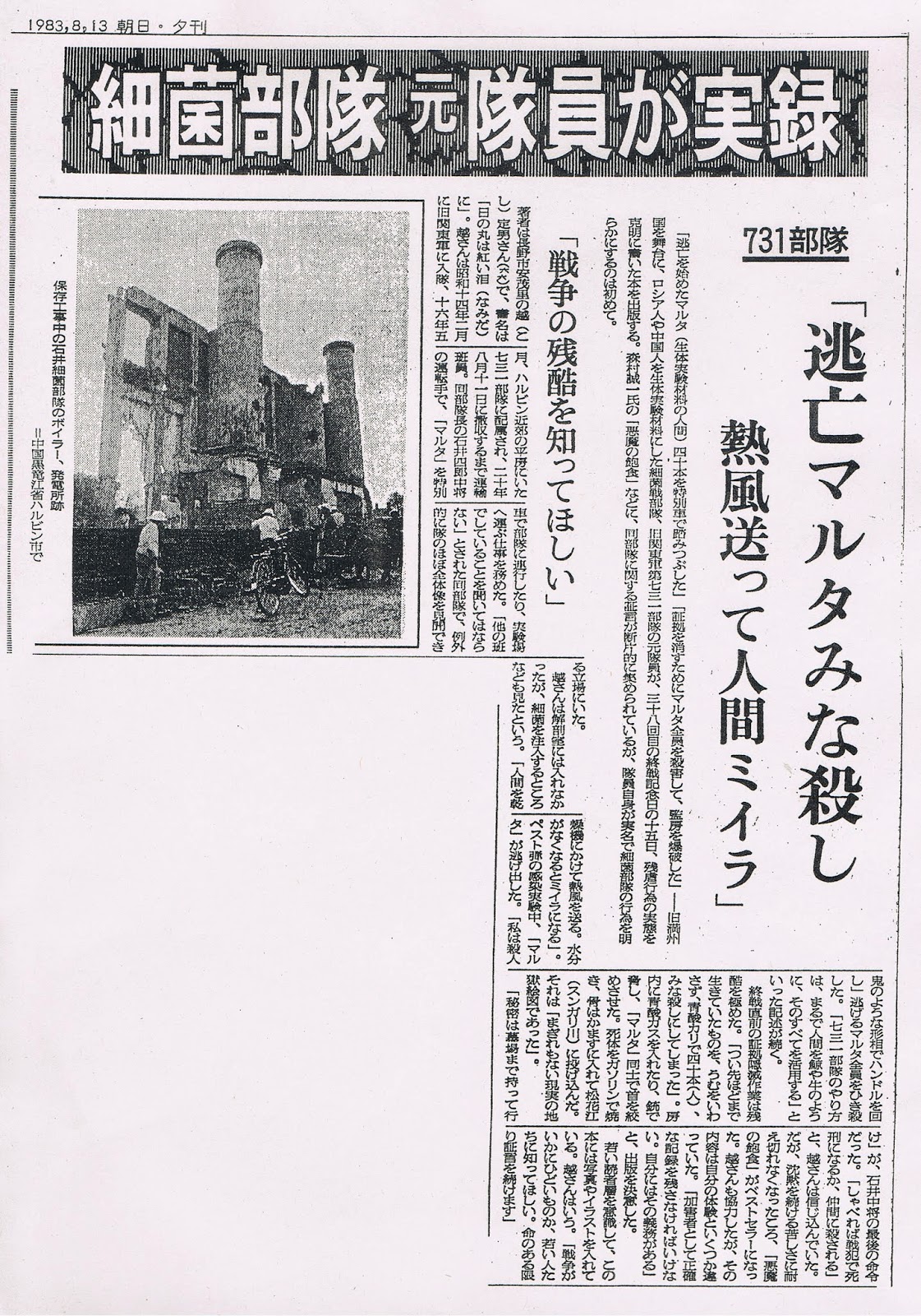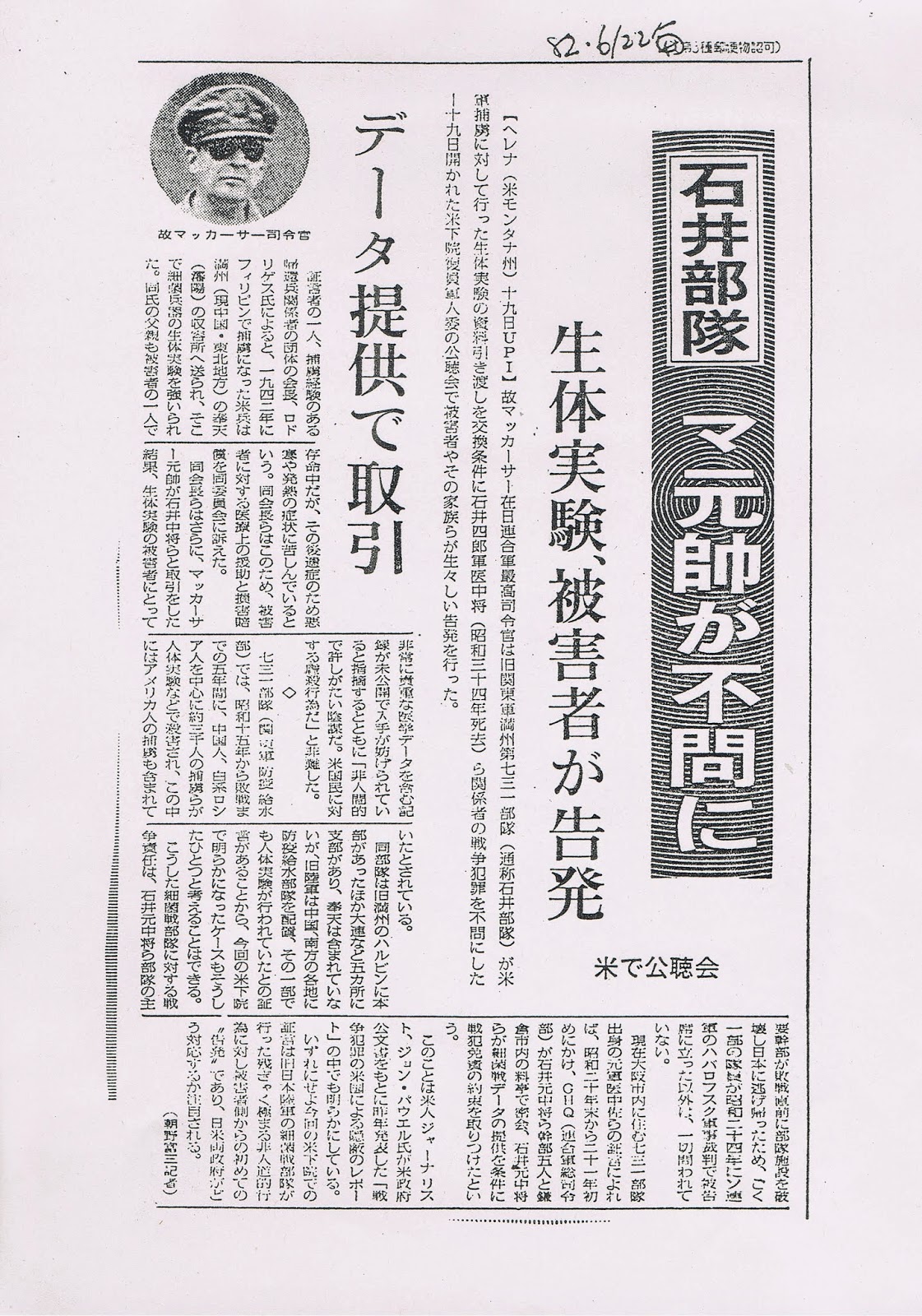 「同氏は旧陸軍の細菌戦戦術専門家で、終戦当時、ソ連側から細菌戦首謀者として戦犯リストにあげらたが、総司令部は証拠がないと反ばく、米軍諜報部に保護され、戦犯指定をまぬかれ話題となった。」(毎日新聞1959年10月11日)