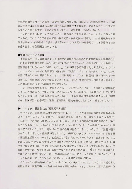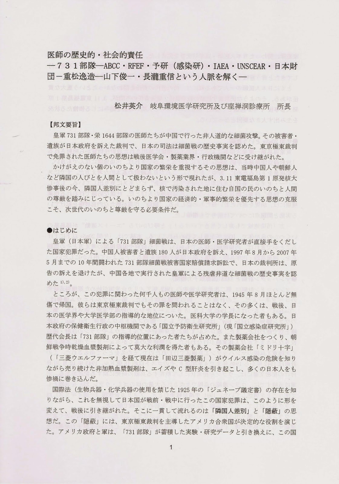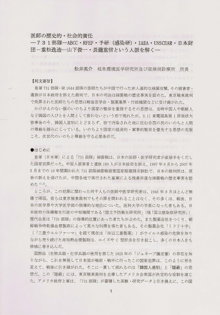 「医師の歴史的・社会的責任ー731部隊ーABCC・RFEF・予研(感染研)・IAEA・UNSCEAR・日本財団ー重松逸造ー山下俊一・長瀧重信という人脈を解くー」