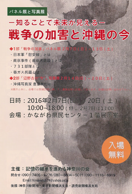 シンポのチラシに、 こんな記述がある。 「 《韓国・中国の日本による植民地支配と侵略戦争の被害者》 と 《日本で安倍政権の戦争法に反対する市民》が一堂に集まり連帯と交流の場を持ちます。 この連帯・交流の集いは、戦争に突き進む安倍政権への反撃の第一歩です」