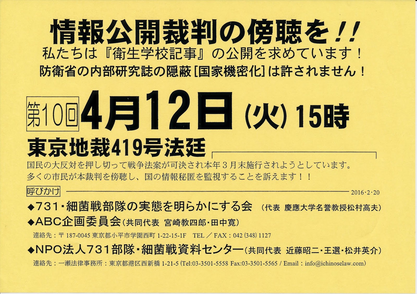 1昨年(2014年)、裁判の途中で被告の防衛省側から「『衛生学校記事』の一部(28冊)が見つかりました。発見された文書には731の記述はありませんでした。」という回答が口頭であった。だが、見つかった場所は、発行元ではない「防衛医科大学の図書室」からである。これも色々考えると、さもありなんなんか?医科大学で生物兵器の研究?731 の記述はないが生物戦の記述はどうだったのか?文書での回答はない。