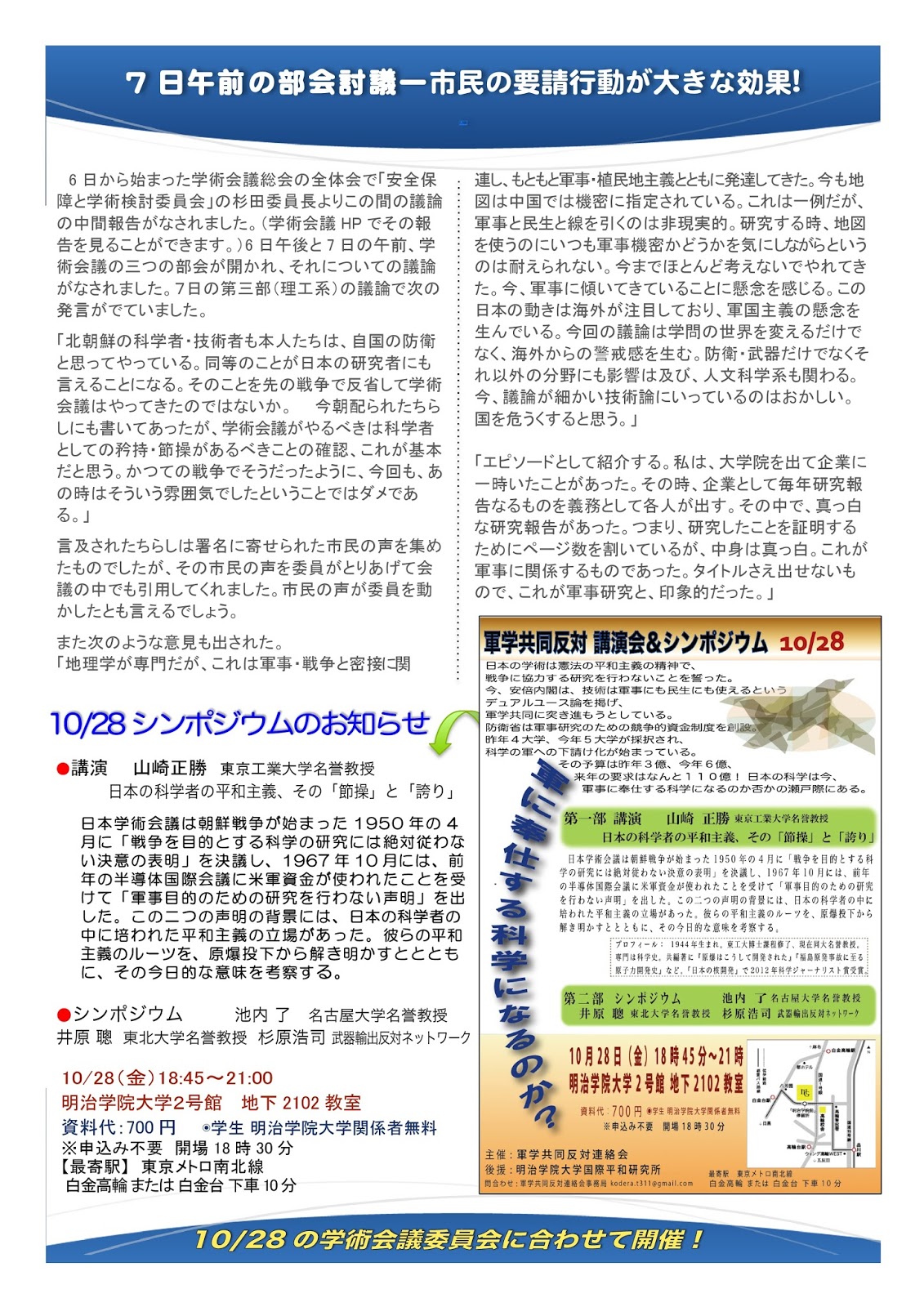 患者の命を守るべき医学者・医師が「研究」の名目のもとに残虐な行為を行う加害者となり、戦後は「人体実験」などのデータ供与と引き換えに米国政府から免責され、わが国の医学界は一貫して検証も反省もせずに事実を隠蔽したまま現在に至っている。このように「731部隊」の問題には、軍事研究が行き着く先のすべてが含まれている。私たちは本会の設立以来、多くの資料や証言によってこの日本で実際に起きた医学者の加害の歴史について検証を進め、二度とこのような過ちを繰り返すべきではないと日本医学会や日本医師会を始め、医学界に強く警鐘を鳴らしてきたのである。今回の学術会議の動きは、まさにその過去の大きな過ちへの道を再びたどるものと危惧する。