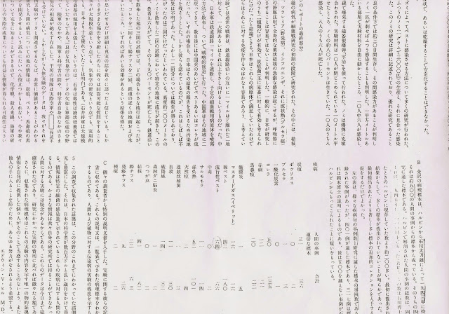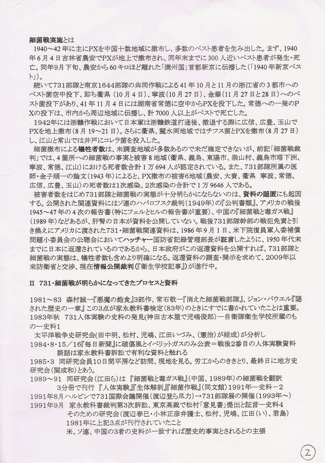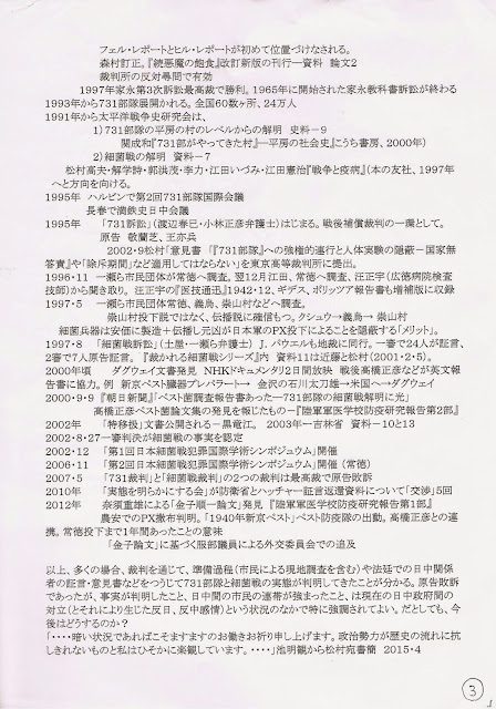 1昨年(2014年)、裁判の途中で被告の防衛省側から「『衛生学校記事』の一部(28冊)が見つかりました。発見された文書には731の記述はありませんでした。」という回答が口頭であった。だが、見つかった場所は、発行元ではない「防衛医科大学の図書室」からである。これも色々考えると、さもありなんなんか?医科大学で生物兵器の研究?731 の記述はないが生物戦の記述はどうだったのか?文書での回答はない。