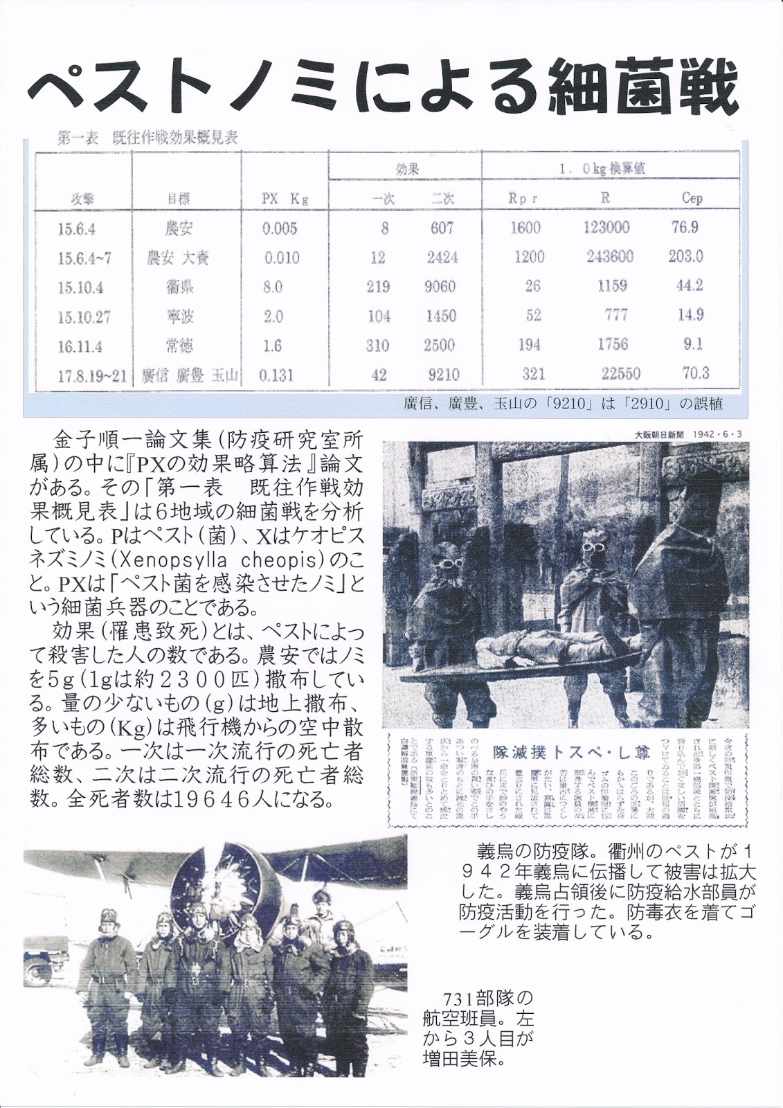 「-日本は1931年(昭和6年)満州に細菌戦遂行のため〈731〉部隊を編成した。研究所、部隊は逐次整備され1935年(昭和10年)には、ねずみ2000匹を使用してノミを飼育し、ペスト菌の培養量だけでも毎日10㎏に及んだ。