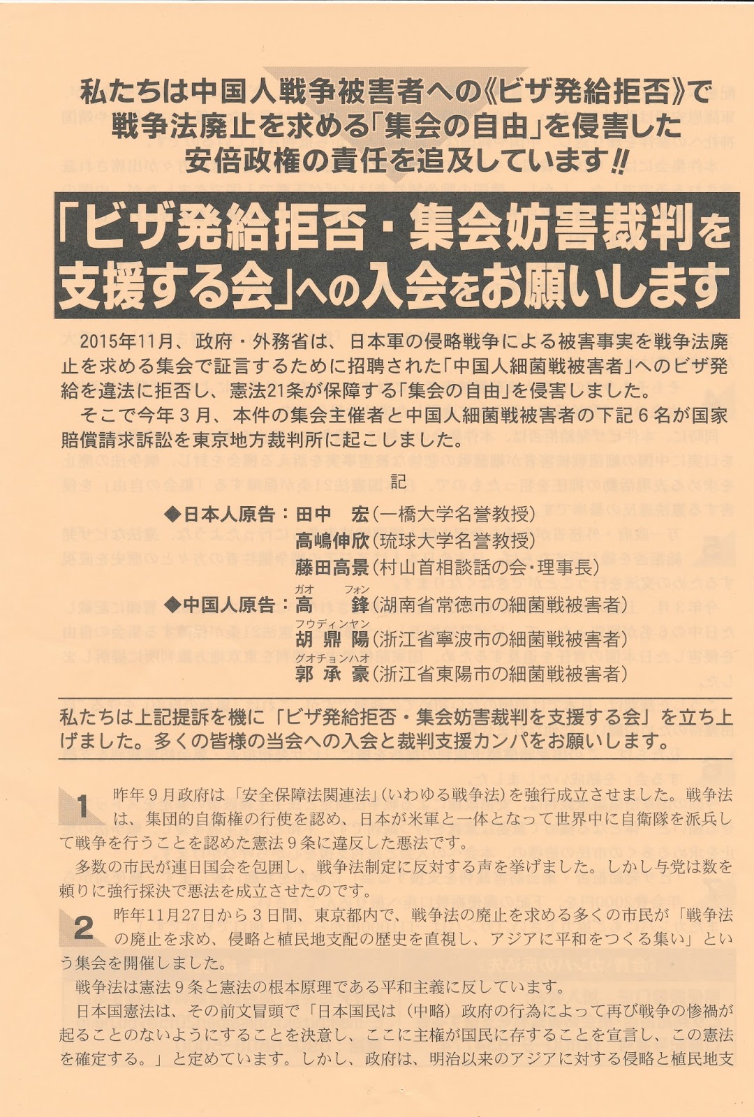 中国人細菌戦被害者遺族が日本の集会で細菌戦のことを報告しようと、ビザの申請をしたところ、外務省がビザの発給を拒否しました。そんなことが2度ありました。2度目は裁判の原告して証言しようしたら、これも拒否です。明らかに日本国政府は細菌戦の事実を闇に葬ろうとしている暴挙です!!なぜ、日本政府は、加害の事実を明かにしないで、消し去るのか!!