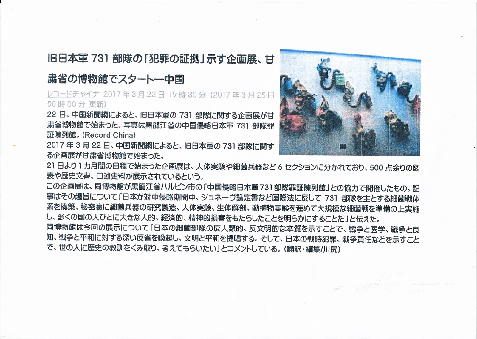 日本の平和団体が731部隊によって実験材料にされた犠牲者を4月に慰霊した。16