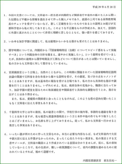 その上で、国家戦略特区の選定作業について、「個人的な関係があってもなくてもプロジェクトの選定とは全く関係ありません。国のためになるかで選んでいます」などと発言を繰り返していました。