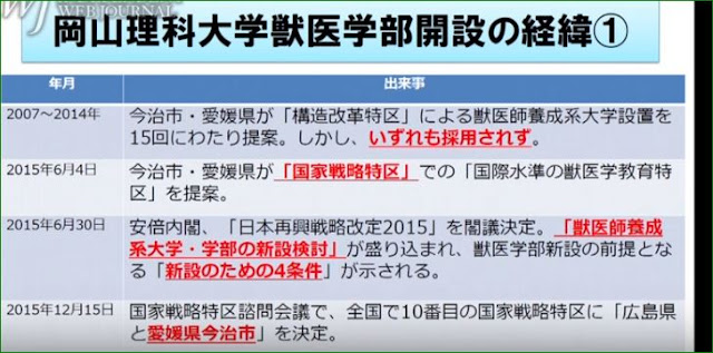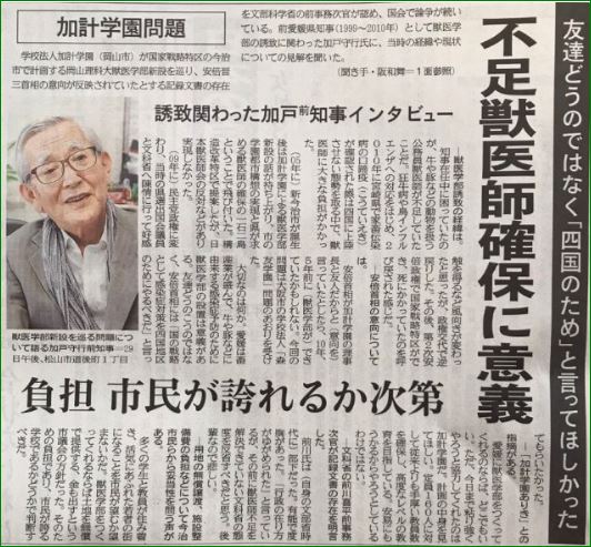 ・・・・同会議の今治市分科会には前愛媛県知事の加戸守行氏が出席。同氏は「日本会議」関連の行事に出席し、安倍首相が本部長の「教育再生実行会議」の有識者メンバーを八木秀次氏、曽野綾子氏らとともに務めたこともある、首相の「右派人脈」のお仲間である。