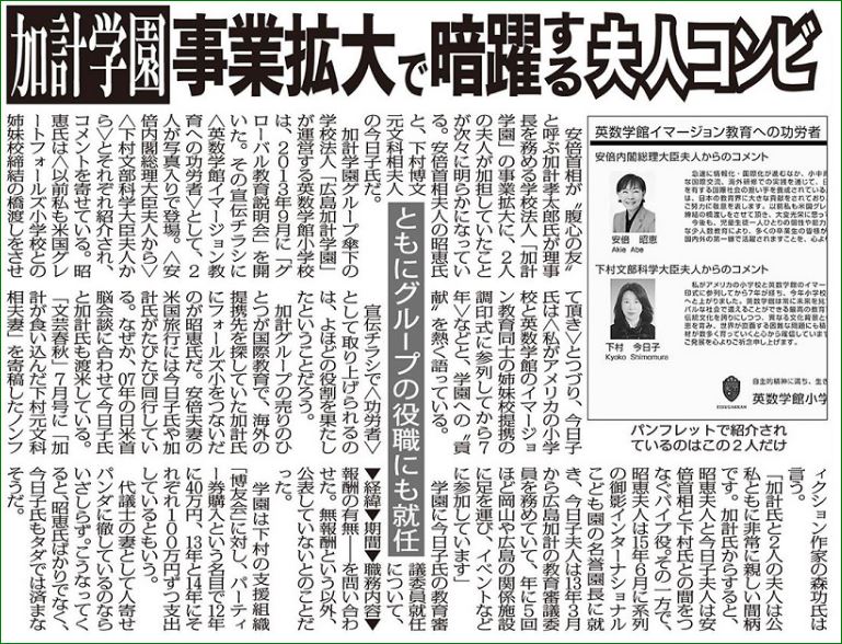 昭恵夫人・・安倍昭恵首相夫人も加計孝太郎氏とは関係が深い。2人はたびたびワシントンやロサンゼルスを訪問して現地の学校法人などを視察している。昭恵夫人が力を注ぐミャンマー支援も加計氏が現地まで同行してサポートした。昭恵夫人は加計学園が神戸市で運営する認可外保育施設「御影インターナショナルこども園」の名誉園長を務めており、15年9月には政府職員2人を連れて施設のイベントに参加している(朝日新聞 5月17日)。
