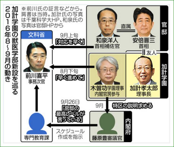 安倍首相・・・首相の長年の友人で「腹心の友」と呼ぶ加計孝太郎氏が理事長を務める学園。2人の出会いは安倍首相が米国に留学していた時代にまで遡る。それ以降、ゴルフや会食などの付き合いが続いており、別荘もすぐ近く。かつて安倍首相は関係者に「加計さんは俺のビッグスポンサーなんだよ。学校経営者では一番の資産家だ」と語っていたという。