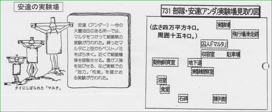 安達で細菌の投下実験をするときは、逃げないように何メ-トル間隔かで「マルタ」を杭に縛り付けて立たせ、