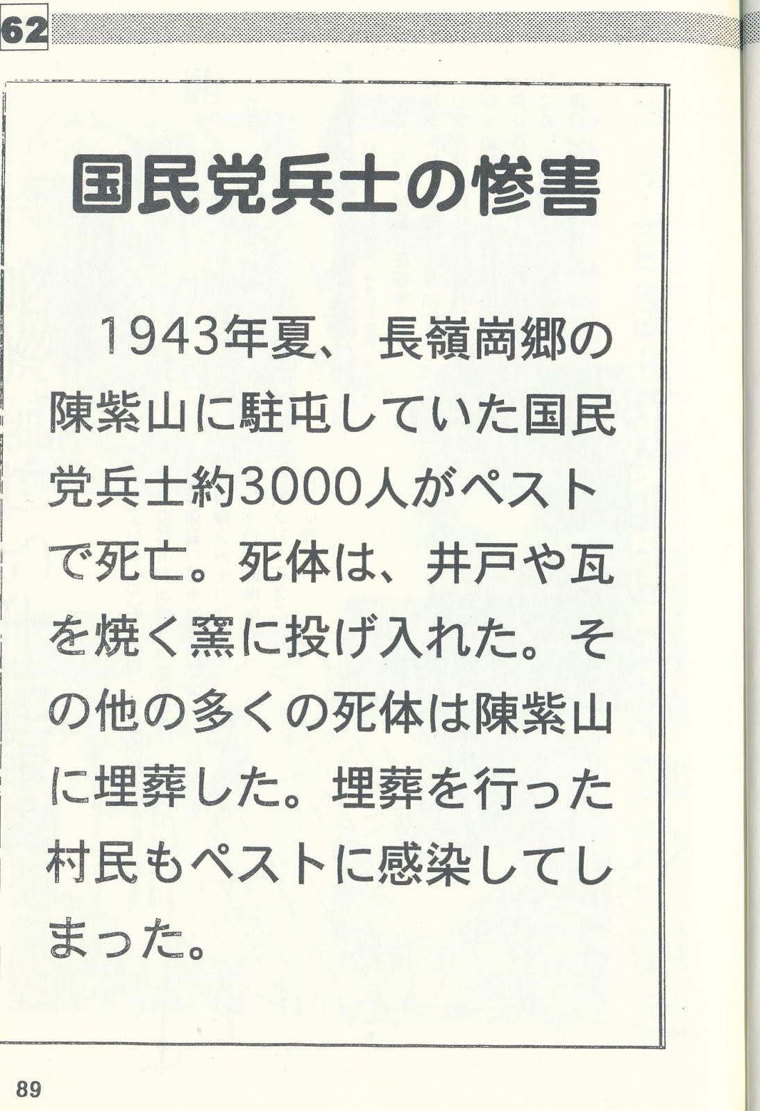 「日本軍が華北で使用した生物兵器は華北の民衆に深刻な犠牲をもたらした。細菌兵器使用の実態が判明しにくいので、統計は不完全であるが、日中戦争以後8年間で70回以上細菌兵器を使用したと推定され、そのうち具体的な死亡者がわかる25件では、兵士・民間人47万人以上が感染して死亡した。山西省孟県における調査では、1942年から45年の間、日本軍が発射した糜爛性(びらんせい)毒ガス弾とチフスなどの細菌兵器により、全県16万人のうち、95%が感染して病気になり、1万1千人が日本軍に殺害され、3万人近くが病死した。」