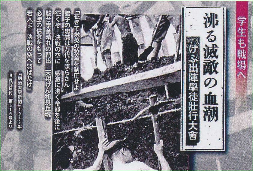 (写真:1940年10月16日付第138号『写真週報』、新聞題字:1943年10月21日付『朝日新聞』より、文:1943年9月17日付『明治大学新聞』より)