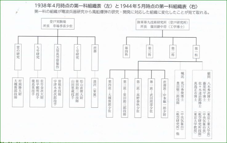 風船爆弾開発の中心となった登戸研究所第一科は、もともとは電波兵器開発などの物理分野を担当する部署で、1936年に陸軍科学研究所に設けられた研究班が母体でした。開発していたのは、電波を使用して人体を攻撃する兵器やレーダーなどでした。1943年に風船爆弾の開発が決定されると、第一科の組織はそのための研究に対応したものに変化していきました。