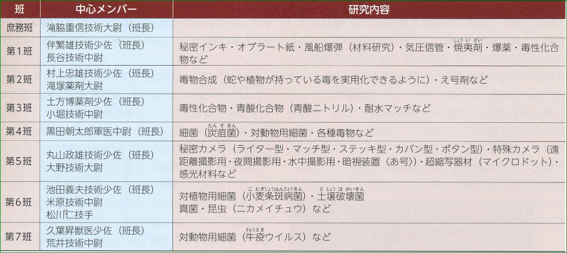第三班は、毒性化合物や青酸化合物の研究を行い、スパイが使用する暗殺用の毒物兵器(青酸ニトリル)の開発に成功した他、耐風・耐水マッチなどを作りました。