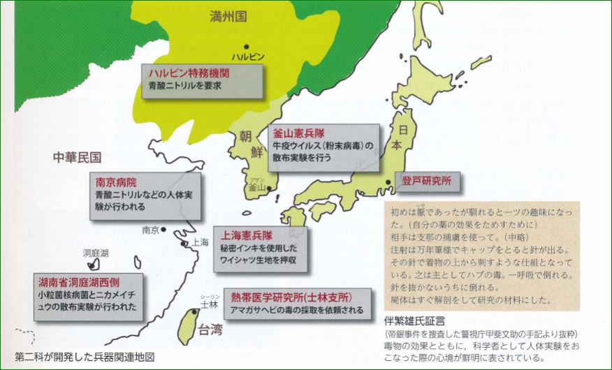 上述の理由のほか、もっと重要なもう一つの要素がある。それは日本で行う化学兵器の実験は、日本の地域が狭く、人口が密集しているという条件の制限である。たとえ実験場を建設しても、土地の居住者と多くの衝突が起こる。しかし、中国東北にでは状況は大きく異なる。東北の土地は広大、人口は比較的少ない。さらに重要なのは植民地であることで、中国東北人民はすでにいかなる主権も自由も喪失し、日本の統治者が意のままに侵略していたから、化学兵器の実験に抗議し、反対することなど思いもよらず、侵略者が欲することは何でもできた。