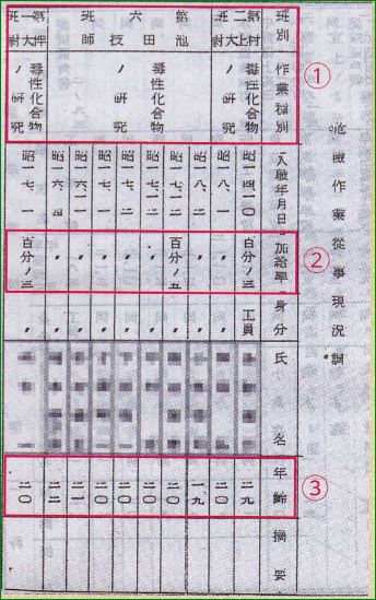 これらの文書からは、第二科のいろいろな様子を読み解くことができます。ここでは「危険作業従事現況調」を読み解いてみましょう。①から第二科の第一、二、六班が「毒性化合物の研究」を行っていたことが分かります。各班が「危険作業」をしていました。②からは「危険作業」の内容によって、給料が増額されていたことが解ります。③からは「危険作業」に19~29歳の多くの青年工員たちが関わっていたことが解ります。以上から第二科では危険が伴う研究も行われていたことが推測できます。