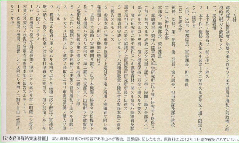 蒋政権の法幣制度の崩壊を策し以てその国内経済を撹乱し同政権の経済的抗戦力を壊滅せしむ