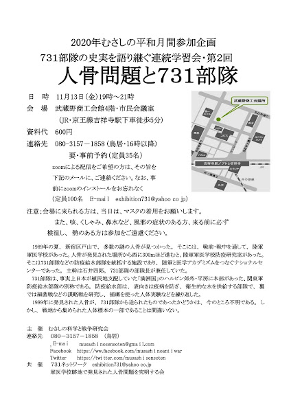 1930年代から1945年にかけて、中国東北部(旧満州)につくられた731部隊と100部隊は、人体実験を繰り返した細菌戦兄弟部隊。開発された細菌兵器は中国各地に撒かれ、多くの中国人民に深刻な被害をもたらしました。100部隊は関東軍軍馬防疫廠から出発した、軍馬の伝染病研究部隊ですが、謎の部隊で、獣医師・化学者達の戦争犯罪の実態が明らかにされてきませんでした。 細菌戦被害者を含めたアジア各国の戦争被害者や遺族は、現在も日本に責任を果たすよう補償を訴えていますが、日本政府は無視を続けています。 また、細菌戦部隊が戦犯免責と引き換えに研究データをアメリカに渡したことで、戦争犯罪に問われなかったことの影響はとても大きいのではないでしょうか。医学者が協力、設定した原爆被害者や公害・薬害被害者の「認定基準」は、多くの犠牲者を切り捨てるための基準となっています。医学者・獣医学者の犯罪は戦前・戦後を通じて続いているのです。 中国ハルピンの731部隊跡地は今、世界遺産に登録される方向にあります。日本が中国に造った部隊施設が、「なぜ世界遺産に値するのか?」過去を知らない人にとって、不思議に思うことかも知れません。外国からも多くの人が訪れる侵華日軍罪証陳列館、日本人はそこでどのような目で見られるのでしょうか。 中国長春では、偽満皇宮博物院内に、「100部隊」の新展示館が2018年12月に開館します。 「日本政府と日本市民には、歴史に関する記憶喪失がある」と国際的に批判されています。 日本人にとって、今、731部隊・100部隊展を行うことは、日本軍による人体実験や細菌戦の意味を考える絶好の機会となるのではないでしょうか。私たちは多くの次世代の若者にこの戦争加害の事実を伝えていきたいと考えています。 皆さま、どうか、あなたの住む地域やグループでこの「731部隊・100部隊展」を開いていただければと思います。連絡をお待ちしています。
