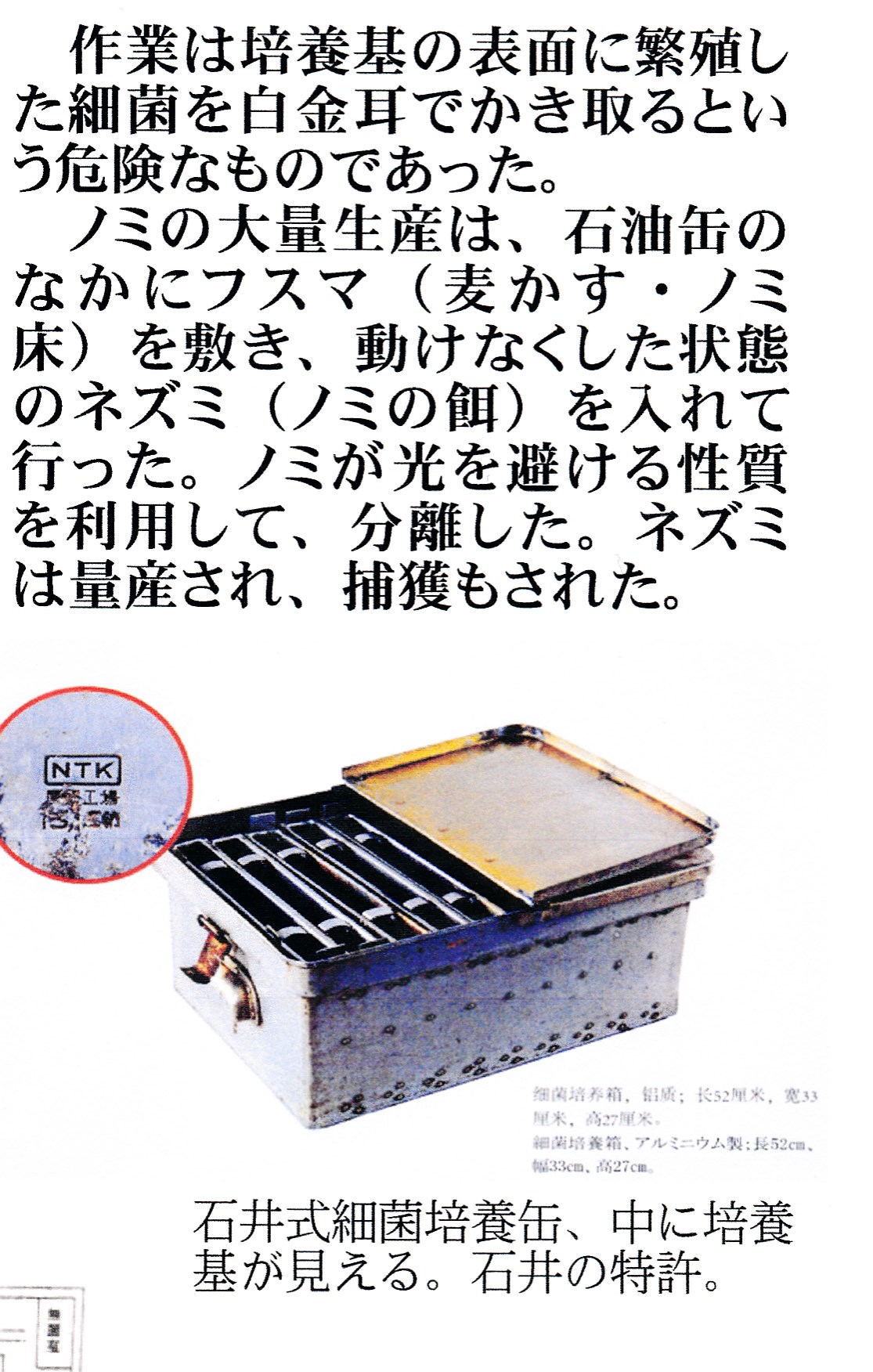 普通病原菌を大量に作るのはワクチンを作る場合だろうと思いますが、それ以外ですと細菌戦以外にはないと思います。ワクチンを作る場合、亀の子シャーレというのが普通使われておりました。亀のような形をしたガラス製のものです。首が比較的長く、雑菌が入らないように操作できるわけです。石井式培養缶は、亀の子シャーレの30倍から40倍の培養能力を持っておりました。細菌の種類によっても異なりますが、この培養缶1つで十何グラムという細菌を作ることが出来ました。