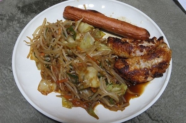 晩ごはん 野菜炒め(焼肉のたれ味) と、 ささみの塩レモン揚げ焼 と 焼魚肉ソーセージ どう見ても、タレ入れ過ぎだろう… もっと見てみる→『のんびりとストレス発散交換日記』 by みんなの交換日記 wakka