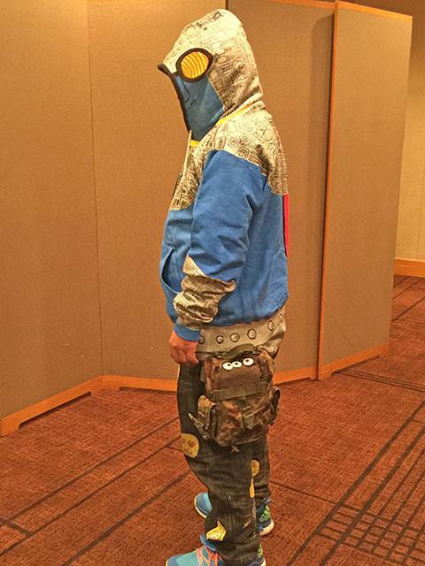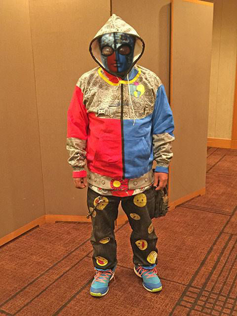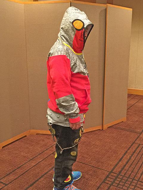 白いパーカーの内側に耐水ダンボールの板を入れる