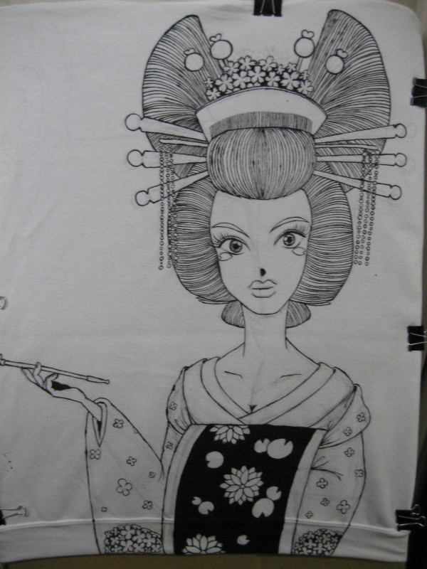 髪の毛まで描いたら、なんとなく着物のガラのデザインを決めたのでそこら辺も描きます。