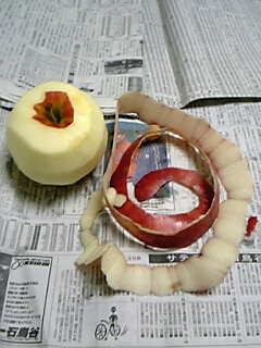 《テスト・フラストレーション》これはテスト勉強中のイライラがピークに達した結果です…笑★暗記しなくちゃいけない事が多すぎて煮詰まる→ストレス→衝動的に林檎の皮剥き勉強を投げ出して、新聞広げてやたら真剣に林檎の皮剥きをする私って…(´Д`;)しかも果物ナイフは無いから出刃包丁でっていうシチュエーション笑★アホすぎて泣けてきます…。