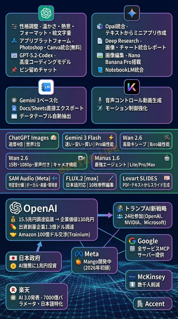 Meta:新しいAI画像・動画モデルを開発中 トランプ政権:AI新戦略に主要24社が参加 Amazon:OpenAIに100億ドルの追加投資を交渉中 マッキンゼー:AI導入により数千人の人員削減へ 藤井聡太名人:「バイブコーディング」に今年一番ハマった 日本郵便:Nano Banana Pro活用の年賀状作成ツール公開 創薬企業:OpenAI出資先が1.3億ドル調達 声優事務所:ElevenLabsと業務提携 Google:全サービスでMCPサーバー提供へ 楽天:日本語特化モデル「Rakuten AI 3.0」発表