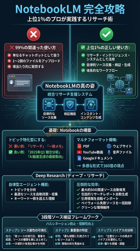 NotebookLM は、単なる AI チャットボットではありません。それは、情報の自律的な収集・厳密な検証・多様な形式での即座のコンテンツ生成という、知的生産の全プロセスを統合した次世代の研究インテリジェンス・システムです。