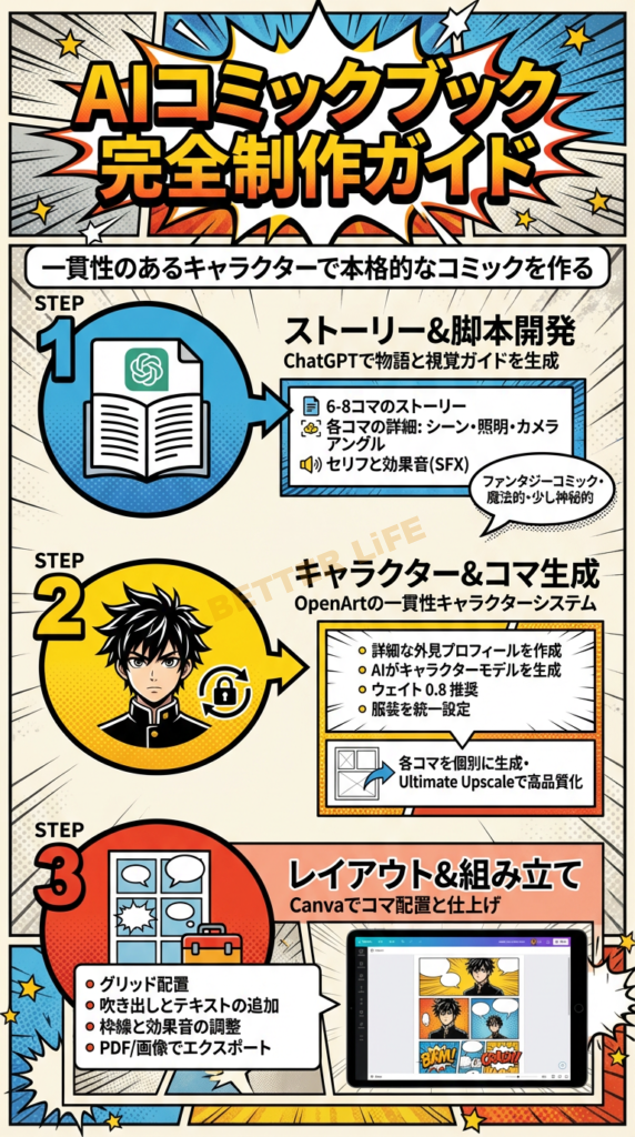 - Canva でのレイアウトデザイン:動的なパネル配置と心理的に効果的なフォント選択で、漫画として完成