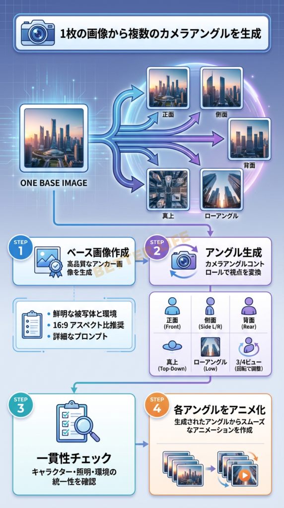 - 無限の再現性:一度ベース画像を作れば、そこから何度でも異なるアングルを生成可能