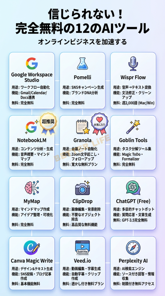 本記事では、オンラインビジネスの自動化、コンテンツ制作、会議管理、戦略立案――あらゆる場面で活躍する12の無料 AI ツールを徹底解説します。これらを使いこなすことで、あなたは高額な企業向けソフトウェアに何十万円も支払うことなく、大企業と同等の生産性を手に入れることができるのです。