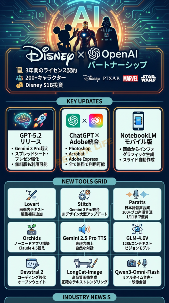 - コンテンツ制作の民主化:ディズニー×Sora、Adobe×ChatGPTなど、プロ級のツールが身近に