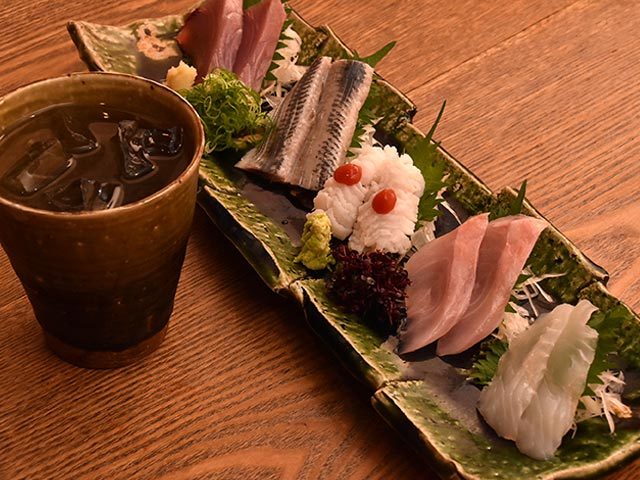 「この前食べたものじゃない料理をお願い」という常連ならではの注文も飛び交うなか、まずは人気のお刺身と自家製割り水の麦焼酎でしっとりと晩酌開始。