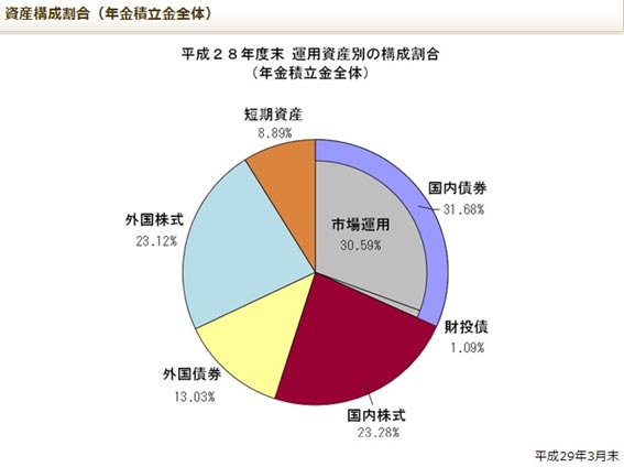 もっとも、GPIFによる年金基金の運用が、こうしたすべての逆風を補ってくれれば、年金の受取額も減少せずに済むかもしれない。そこで、現状のGPIFの資産配分を見てみる。