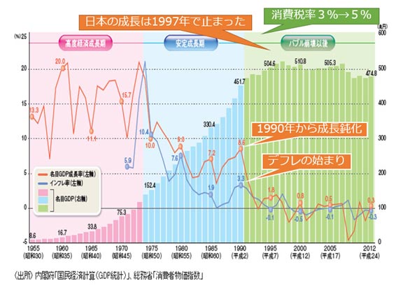 日本経済は消費税を導入した1989年の翌年から成長鈍化し、デフレが始まった。また、消費税率を3%から5%に引き上げた1997年からは縮小が始まった。