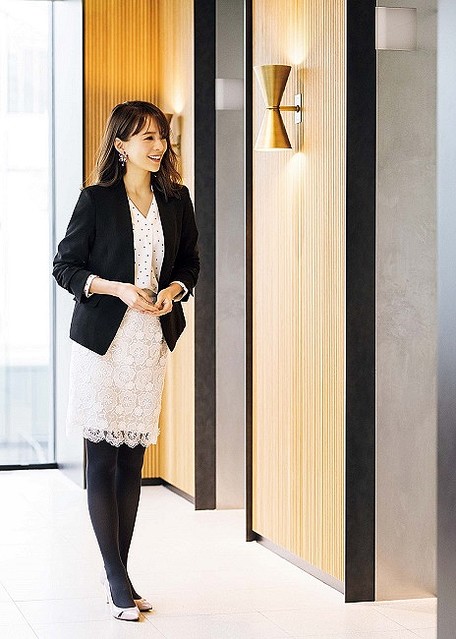 ドット柄やレースなど甘い要素が多くても、ジャケットスタイルならオフィスコードは余裕でクリア。ブラウスのVネックで首元にシャープな抜け感を備えると、大人っぽさが高まります♪