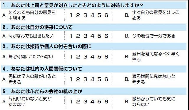 論文では他にも、「やる気」「競争心」「自己研鑽」「闘争心」「社交性」「運についての自信」「能力についての自信」「交渉力」「部下のモチベーション」「適応力」「指導力」「部下の能力開発」「協調性」「明るさ」「決断力」「計画力」「企画力」「批判精神」「柔軟な考え」「論理性」「忠誠心」「ゴマスリ」「ワークホリック」「頼りになる先輩」「上司に密着」「責任感」「忍耐力」「品位」「公平さ」「思いやり」の計35項目の質問が、SD法(6段階)で測定されている。
