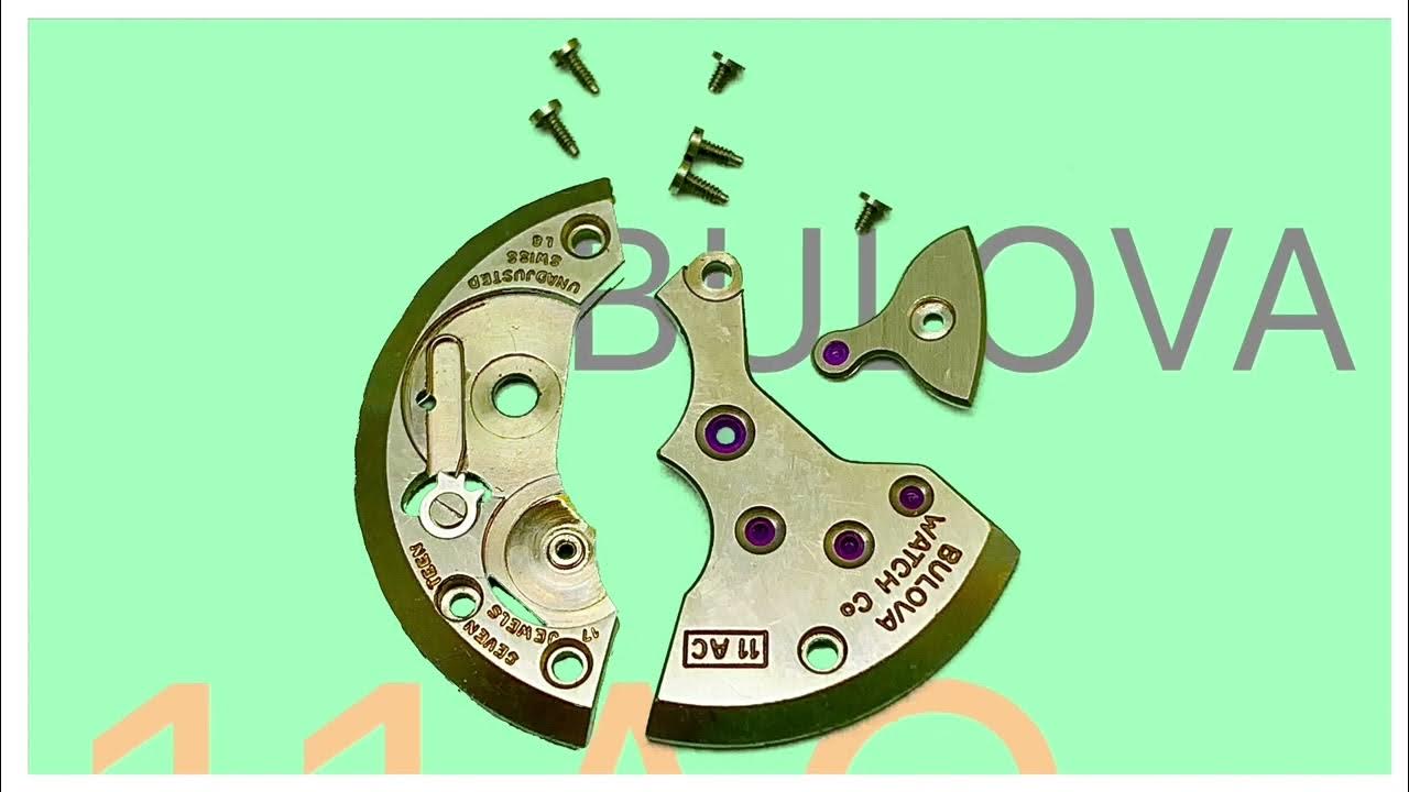 Cal. 11AC ブローバ BulovaBULOVA キャリバー11AC 17石(Jewels)モデルです。1955年〜1958年頃のものです。図1:丸穴車は逆ネジ図2:輪列、香箱図3:文字板側図4:カンヌキ、カンヌキバネ、オシドリYoutube動画BULOVA Cal.11AC Log 分解資料Bulova Cal11ACm.youtube.com