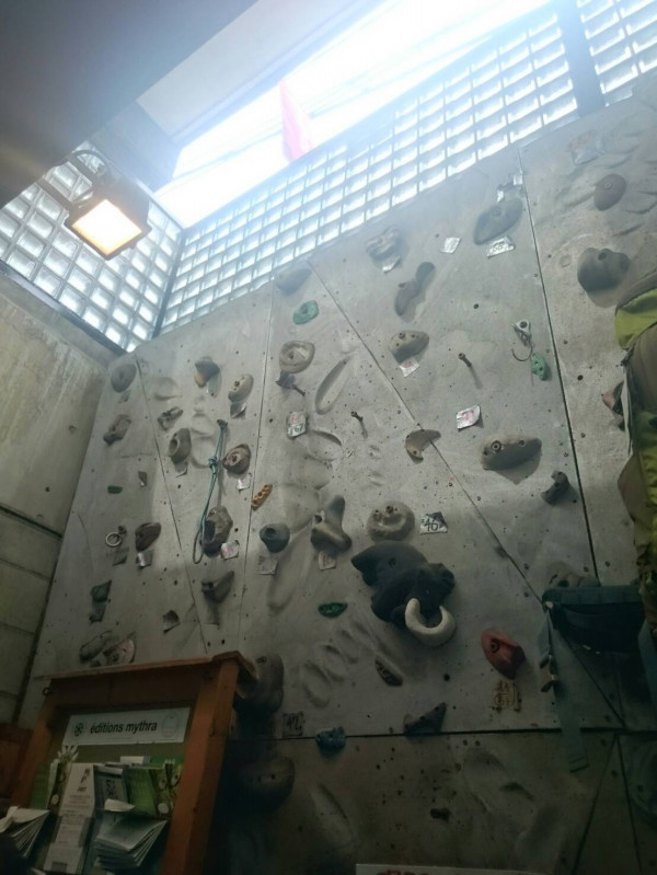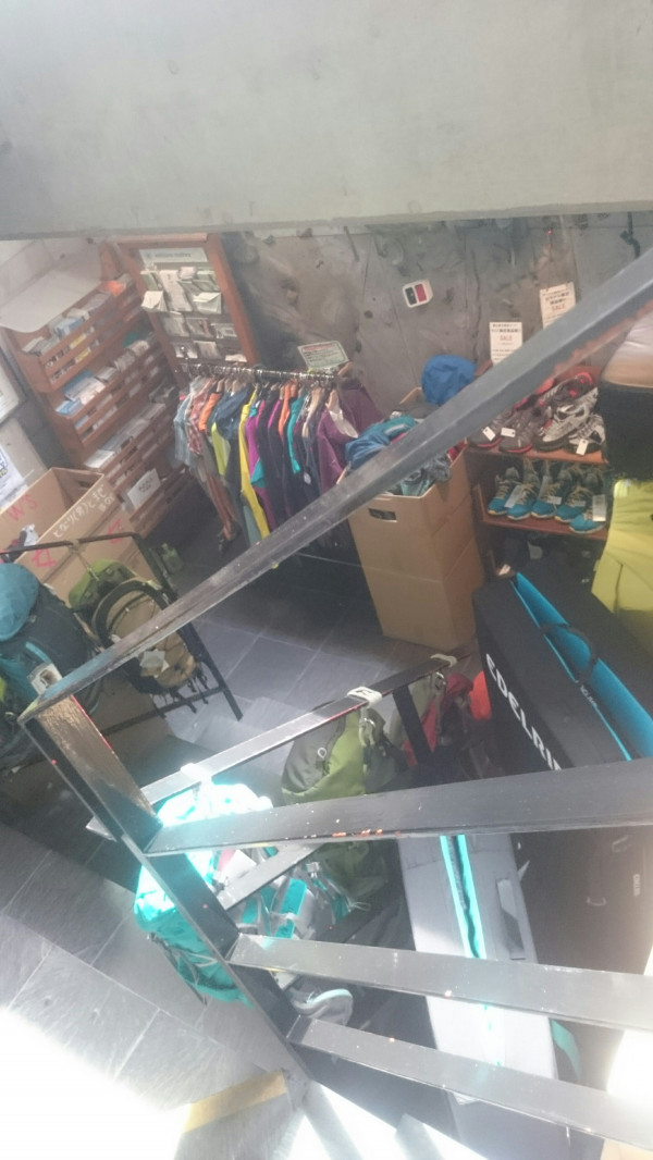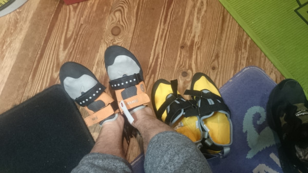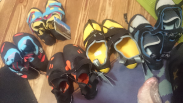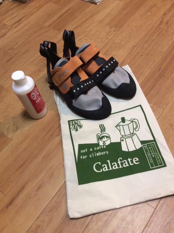ちろっと写ってますがボルダリングシューズは素足で履くので試し履き中はビニール袋を履いて試着します。