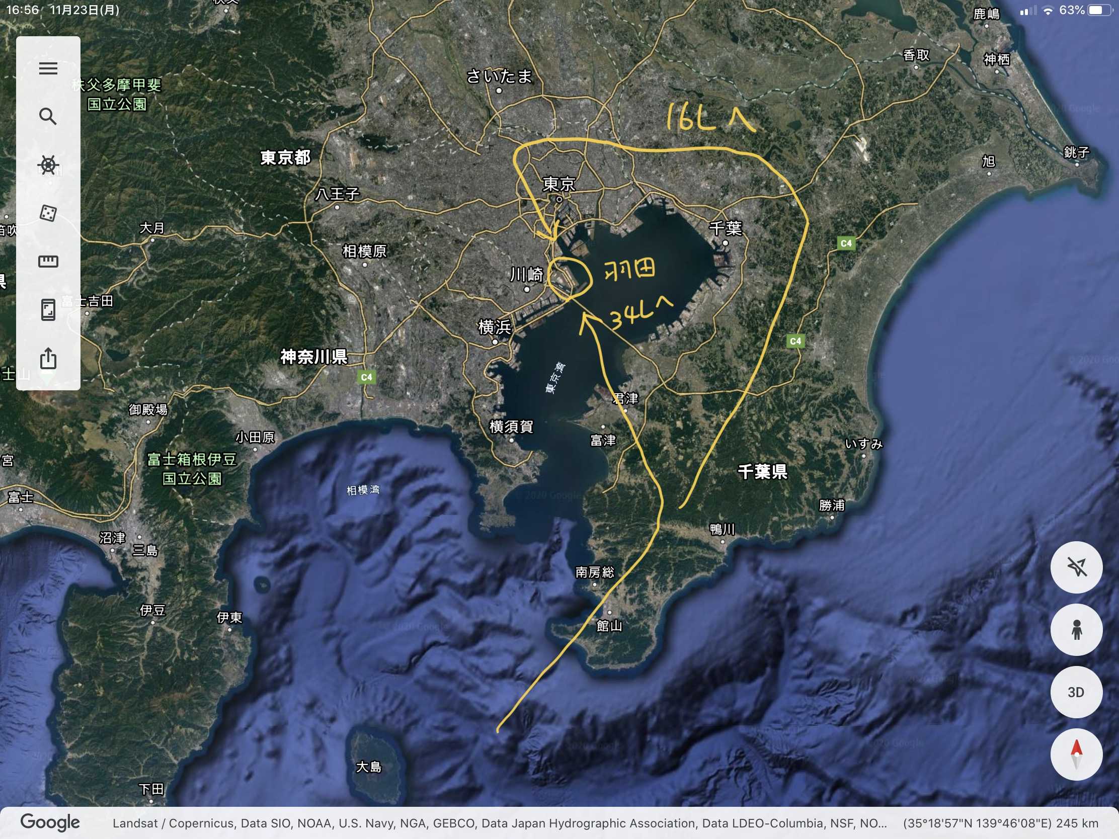 南風運用で西方面からRunway 16Lに着陸する場合、コックピットでは