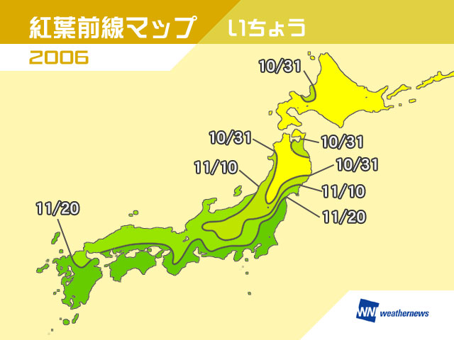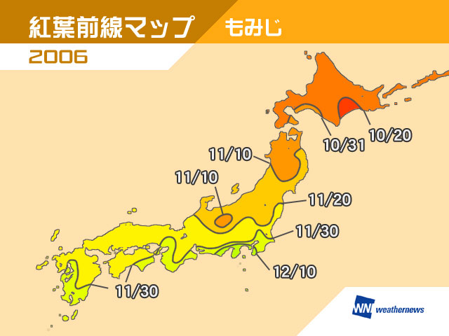 株式会社ウェザーニューズ(所在地:東京都港区、代表取締役社長:草開千仁)は、2006年紅葉シーズンにおける全国の“もみじ”“イチョウ”の見ごろ予測を発表しました。全国の紅葉見ごろ情報に関する今後の最新情報と、全国約800ヶ所の紅葉スポットの最新情報については、本日9月22日(金)からオープンする携帯電話向けサイト「ウェザーニュース」内の『紅葉情報』コンテンツでチェックすることができます。同サイトでは紅葉シーズンを楽しんでいただけるよう紅葉シーズンの本格的な到来にあわせて、サポーター(有料会員)参加型のプロジェクトも実施していく予定です。また、インターネットサイト「ウェザーニュース(http://weathernews.jp/ )」でも、10月初旬より紅葉情報関連のコンテンツを開始いたします。