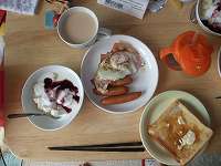 朝ごはんはトースト、ウインナー、ハムエッグをいただきました。