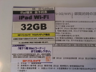 とうとうiPadが発売になりましたね。ヨドバシカメラなら、これまでにためたポイントと、飛行機のマイルをEdyに換金し、少し現金を足すと買えそうです。ということで予約をしてきました。明日の夕方には手にすることができそうです。こんな用途がはっきりしないいいかげんなものを、久しぶりに手にすることができる、ワクワクを感じています。明日は万全の態勢で受け取りに行けるよう、久しぶりに夜中まで残業をして終電車で帰ってきました。明日が楽しみです。予約券がいい加減そうな感じが出ており、下手な学園祭のチケットの様で、笑っちゃいました。