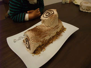 2009/12/26 [Sat] クリスマスパーティー朝ごはんはトーストとハムエッグ、ウインナー、パインとバナナ入りヨーグルトをいただきました。仕事は区切りがついていないのですが、お休みをいただき、久しぶりに髪を切ってすっきりとすることができました。お昼ごはんはリクエストに答えてもらい、お好み焼きをいただきました。晩ごはんはクリスマスパーティーをしました。お手製ローストチキン(パンなどの具入り!、これの写真を取り忘れたのが残念)、お手製木の形をしたケーキ、ブッシュドノエルをいただきました。特性ソースも美味しかったです。