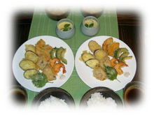 天麩羅(蓮根のはさみ揚げ・茄子・かぼちゃ・ゴーヤ・さつま芋・海老・大葉) 茶碗蒸し 納豆と白ネギのみそ汁 押し麦入りご飯