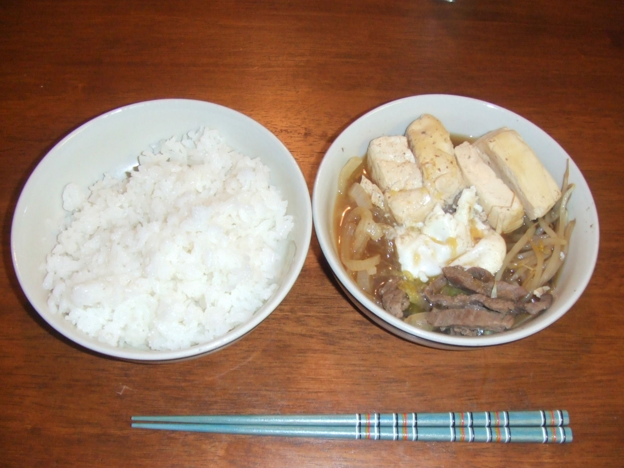 彼に影響されすき焼きを作りました。スライスされた肉がないのと材料が揃わないのとで完璧なすき焼きとはいかなかったけど。料理名は『すき焼き風 牛肉の豆腐の白菜のタマネギの玉子のもやし煮』。生玉子に信頼を置けなかったので一緒に煮ました。味は申し分ありません。