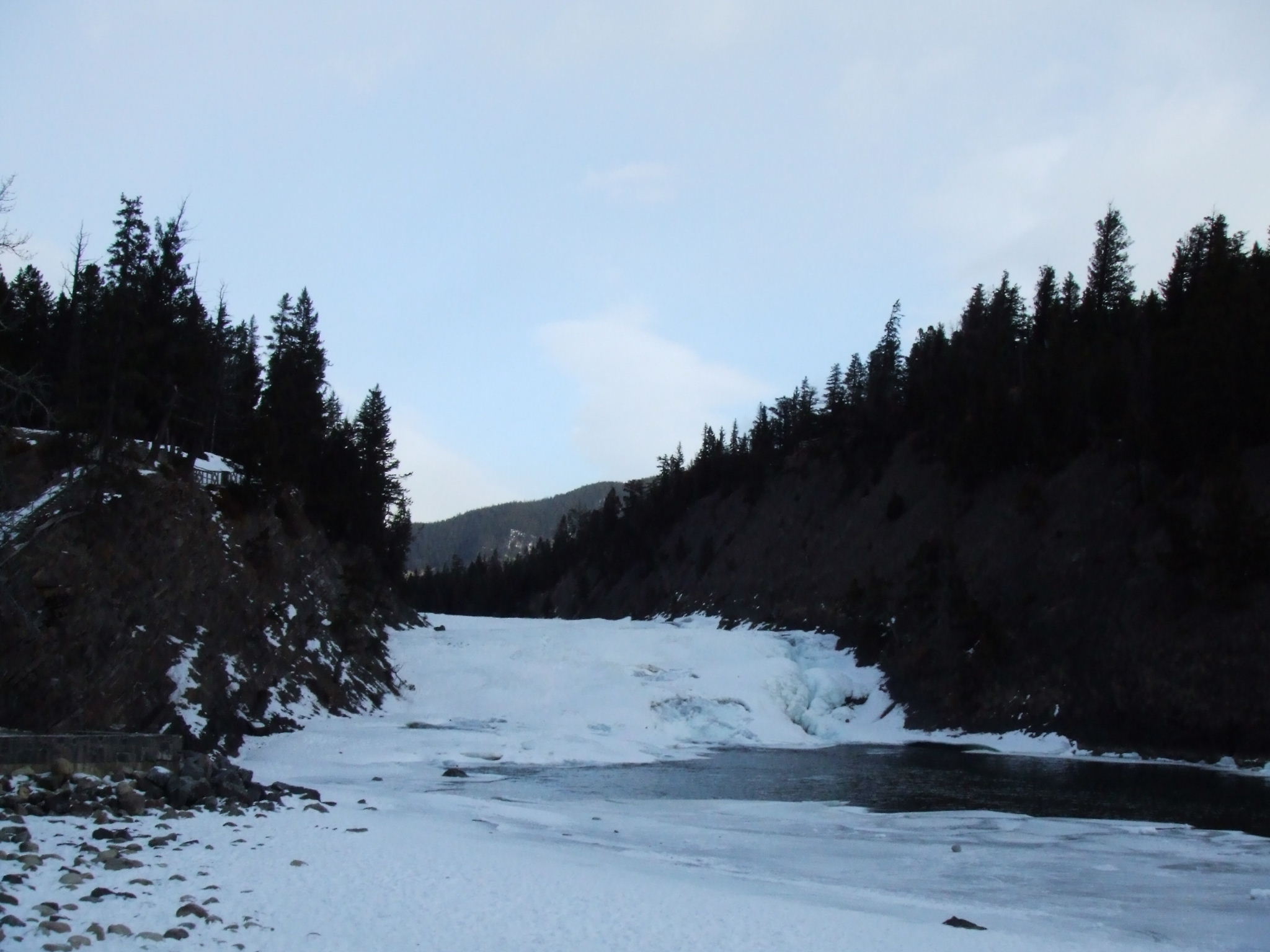 Banffを静かに流れるボウ川がこの滝で渦を巻き急流となる。今はその荒々しさの跡を残し凍結中。