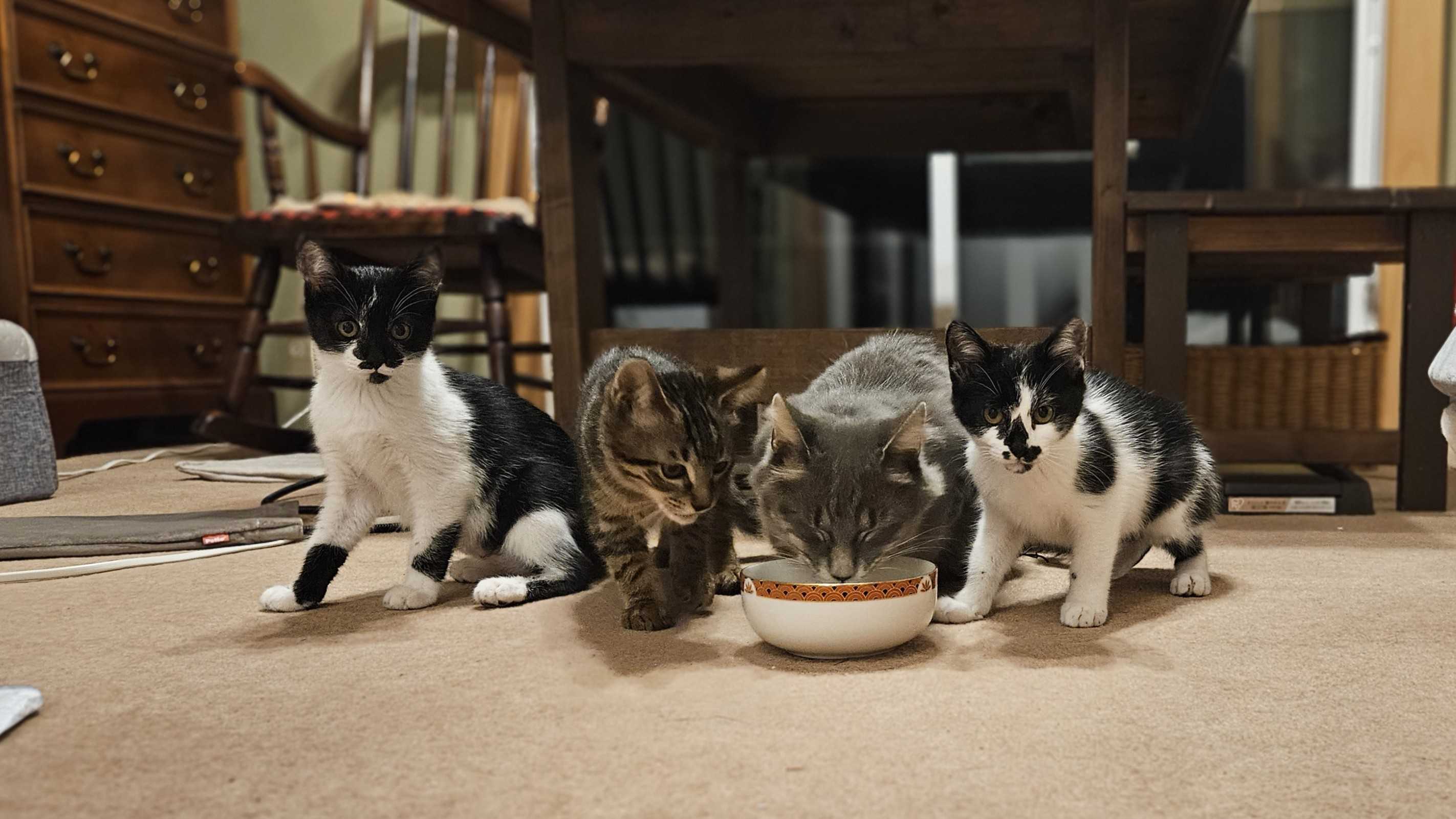 左から、お母さんねこのさくらちゃん、真ん中の二匹は女の子で渡辺さん(仮)と中尾さん(仮)www、右端は男の子でまめぞう君(マ・メゾ フランス語っぽく発音!?)